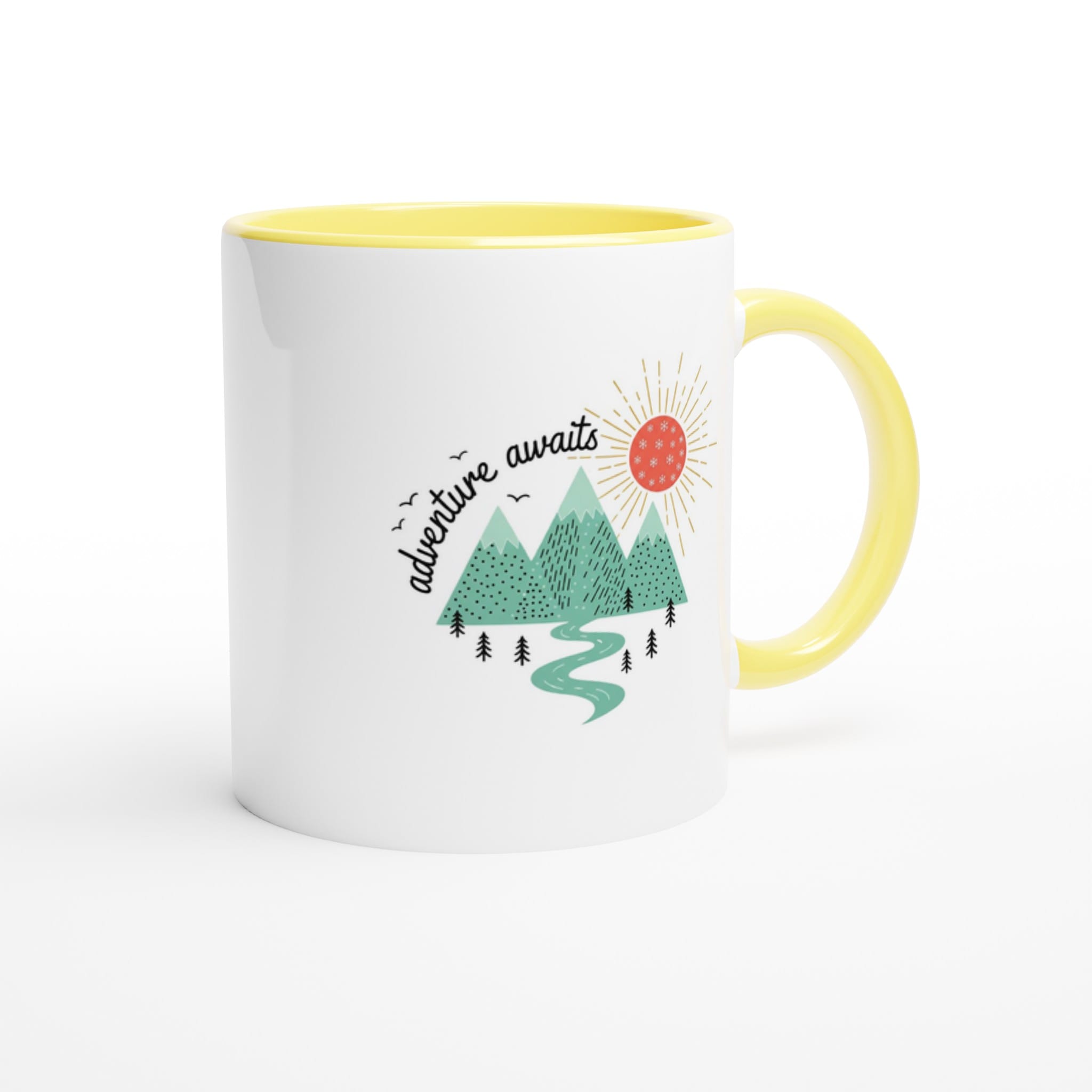 This Adventure Awaits Mug is perfect for your morning coffee or tea, a hot chocolate, or any beverage. It’s crafted in glossy white ceramic with a colored rim, inside, and handle too.