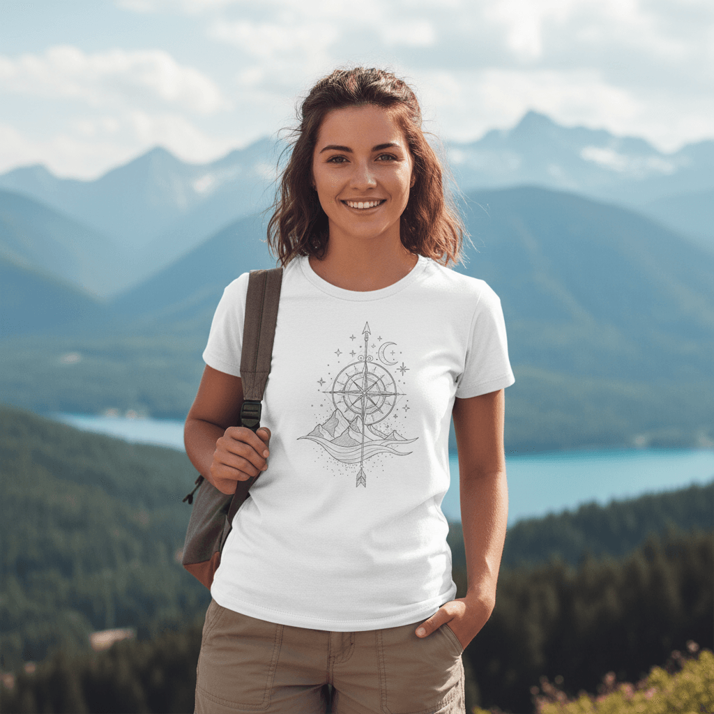 Our Follow Your Compass Organic T-Shirt subtly captures the spirit of adventure that lives within all of us avid hikers and/or campers.