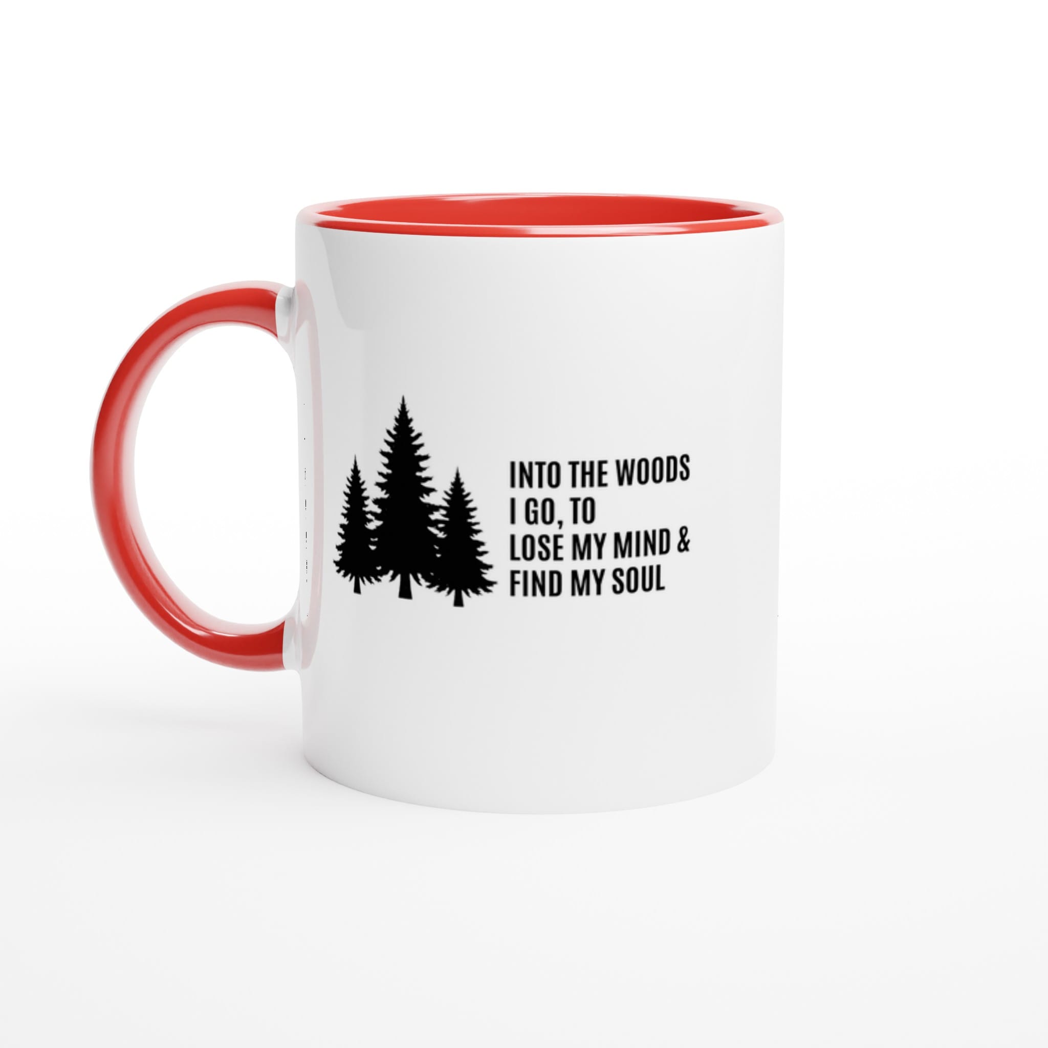 This cleanly designed Into the Woods I Go Coffee Mug is perfect for your morning coffee or tea, a hot chocolate, or any beverage. It’s crafted in glossy white with a colored rim, inside, and handle.