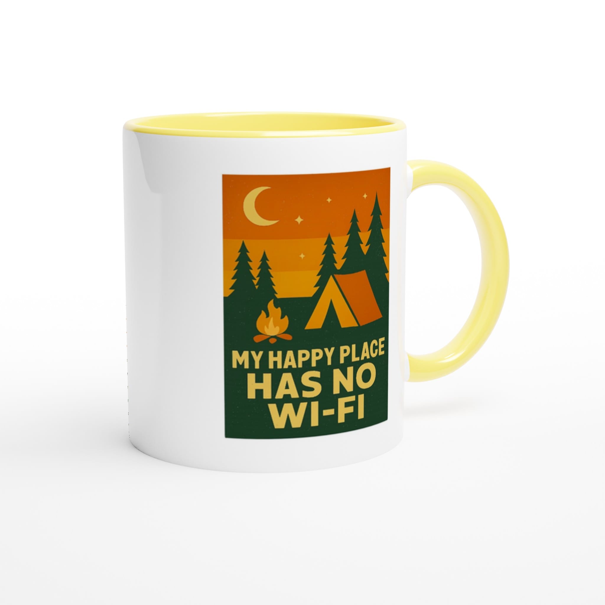This My Happy Place Has No Wi-Fi Mug is perfect for your morning coffee or tea, a hot chocolate, or any beverage. It’s crafted in glossy white ceramic with a colored rim, inside, and handle too.